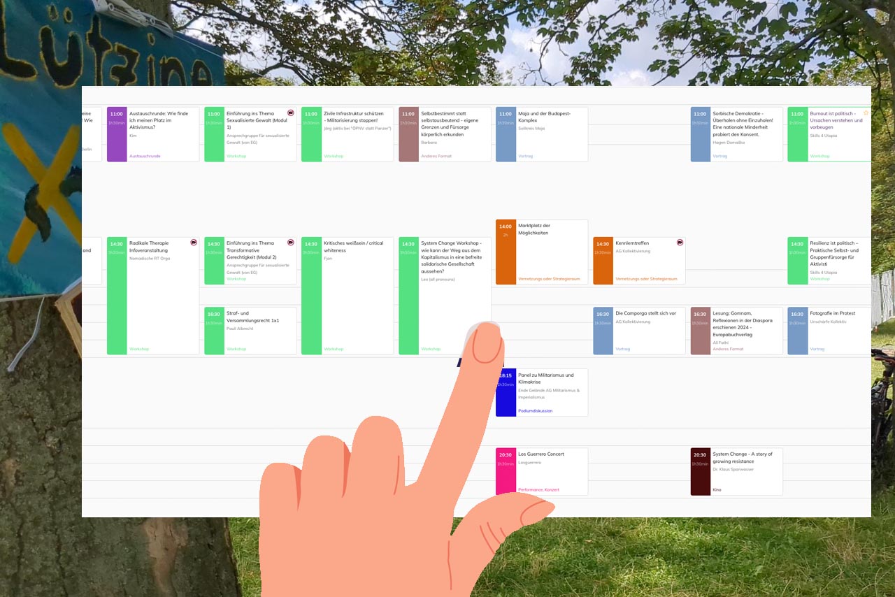 Die Programm-AG versteht sich als Koordinierungsstruktur zwischen Menschen und Gruppen in den unterschiedlichen Bewegungen und der System Change Camp-Orga. Wir kümmen uns um den Call for Content, den Kontakt mit den externen Zelten, das Moderationsmaterial und sind insgesamt zu Fragen über das Programm erreichbar. (Schau gerne in den FAQ, ob wir deine Frage da schon beantworten, bevor du uns kontaktierst.)